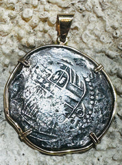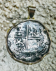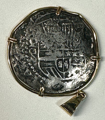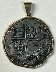 Encased in a finely crafted 14k gold bezel, this genuine 8 Reales Spanish Cob Coin from the historic Atocha shipwreck embodies a remarkable slice of Spanish heritage. Merging precious metal elegance with a rare artifact, it delivers lasting beauty and a powerful link to history. Ideal for collectors or as a one-of-a-kind gift, this piece combines skilled artistry with deep cultural meaning, making it a captivating highlight in any jewelry collection or treasure trove.