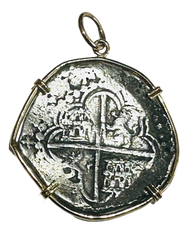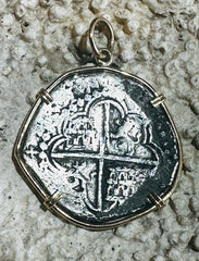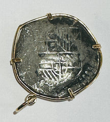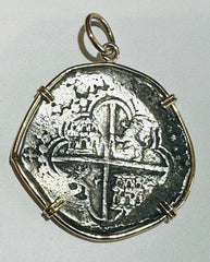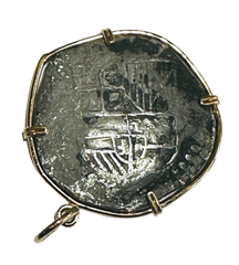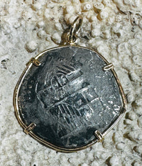 Encased in a finely crafted 14k gold bezel, this genuine 8 Reales Spanish Cob Coin from the Spice Island shipwrecks embodies a remarkable slice of Spanish heritage. Merging precious metal elegance with a rare artifact, it delivers lasting beauty and a powerful link to history. Ideal for collectors or as a one-of-a-kind gift, this piece combines skilled artistry with deep cultural meaning, making it a captivating highlight in any jewelry collection or treasure trove.